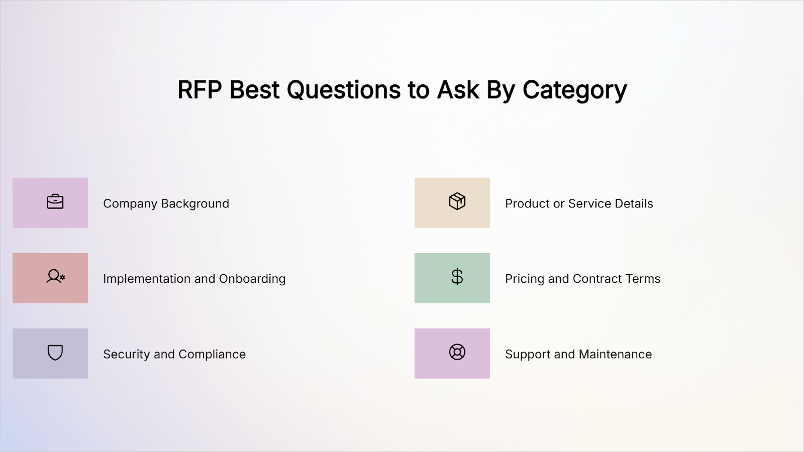 The best RFPs go beyond pricing. They uncover whether a vendor truly meets your needs. Here’s a breakdown of 31 essential RFP questions to ask vendors, grouped by category.