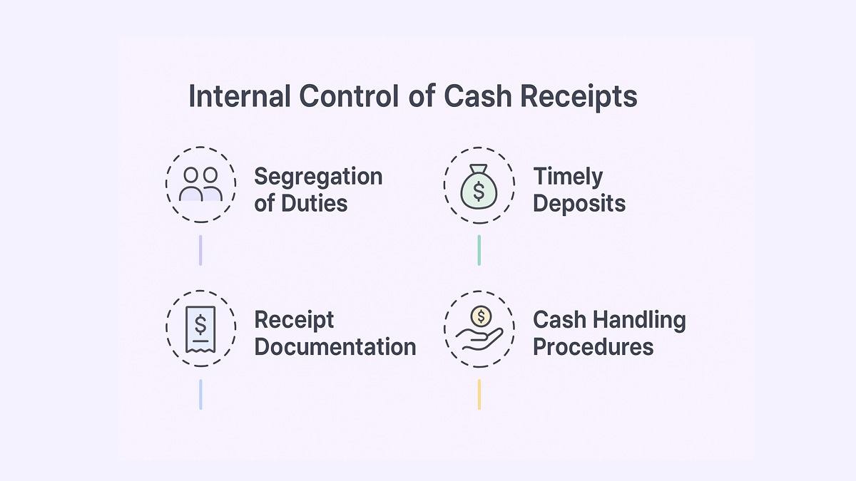 Segregation of duties, timely reconciliation, restricted access, and proper documentation are the core pillars of cash control. Together, they reduce errors, prevent fraud, and ensure accurate financial records.