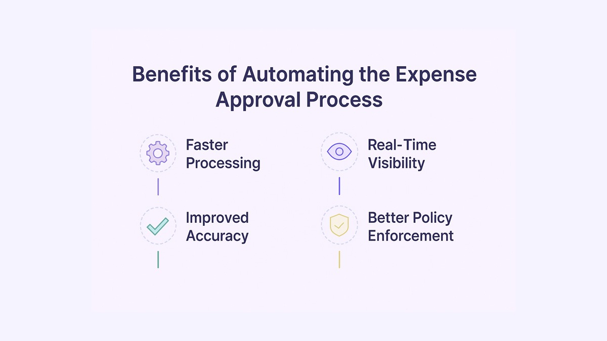 Automation speeds up processing, improves accuracy, and ensures policy compliance. It also reduces manual errors, saves time for finance teams, and gives real-time visibility into spending trends.