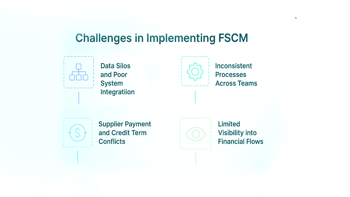 While FSCM offers significant benefits, businesses often encounter obstacles during implementation. These challenges can hinder visibility, disrupt processes, and reduce the effectiveness of optimization efforts.