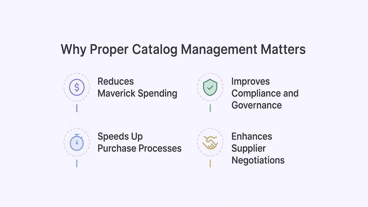 A well-maintained catalog ensures accurate pricing, reduces unauthorized spending, and speeds up the purchasing process - all of which contribute directly to cost savings and better procurement ROI.