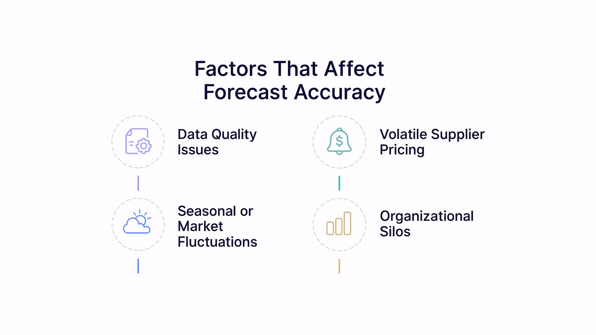 Even the most advanced forecasting models can miss the mark if the inputs are flawed or external conditions shift unexpectedly. Understanding what can throw off your spend forecast is key to improving its reliability. Here are the major factors that impact forecast accuracy: