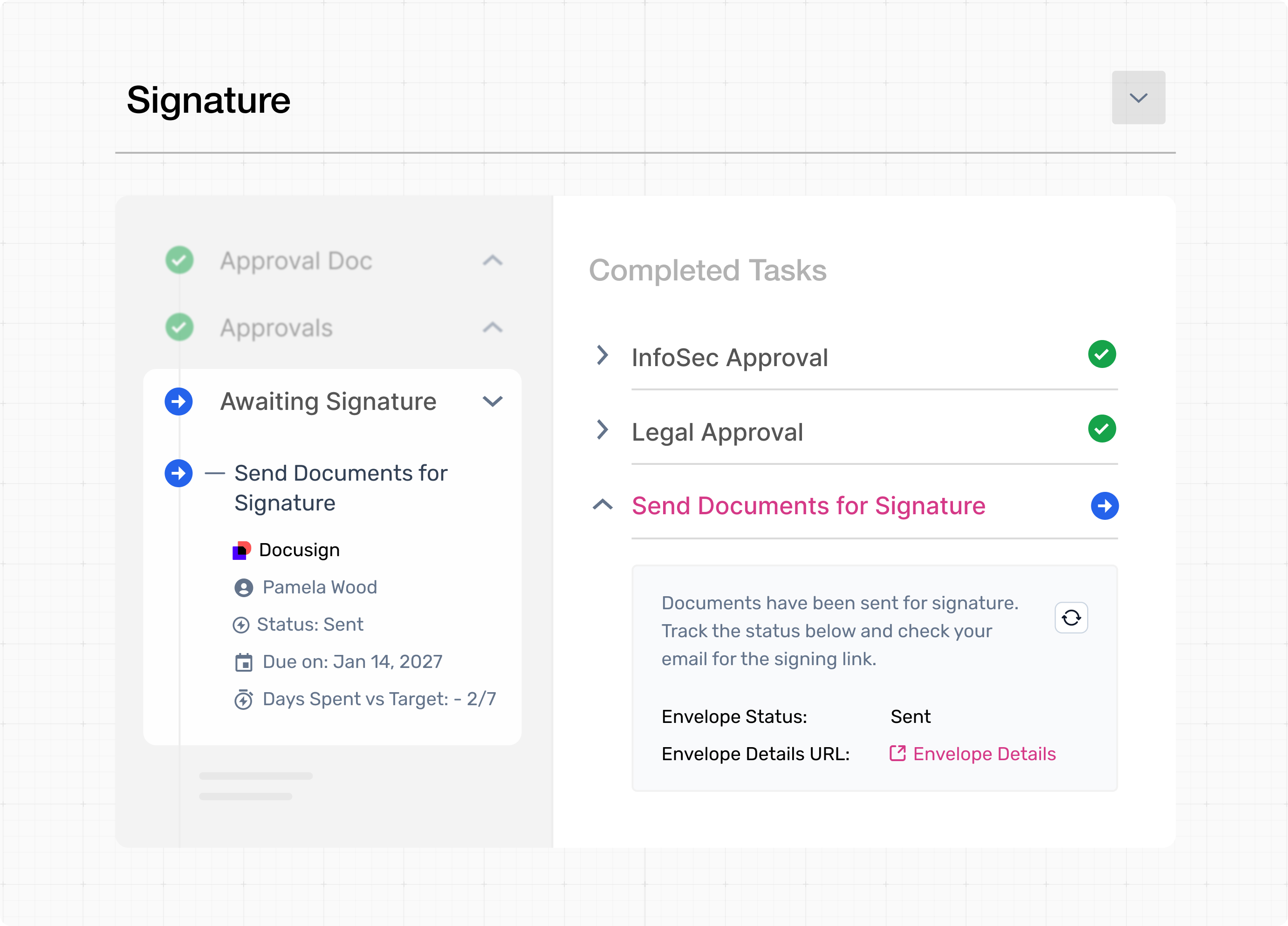 Procurement and legal teams lose valuable time at the final stage of purchasing: getting contracts signed. Manual uploads into DocuSign, unclear signer ownership, and constant follow-ups can delay execution by days - sometimes weeks, even after approvals are complete.