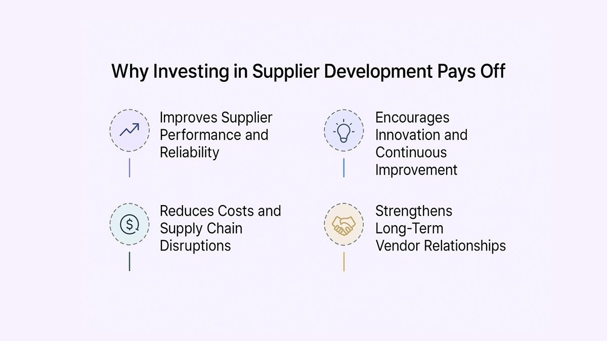 Supplier development helps improve quality, reduce costs, and build stronger, more resilient partnerships. It also encourages innovation, reduces risk, and aligns suppliers with long-term business goals.