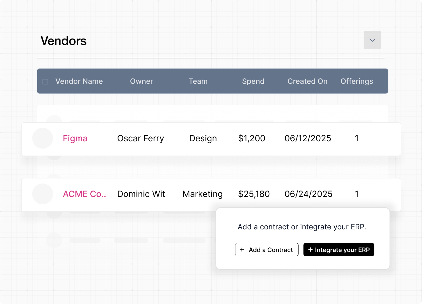 Spendflo fetches and maps Coupa vendor IDs to ensure vendor data is always in sync. Manage contracts and relationships effortlessly from a centralized listing page.