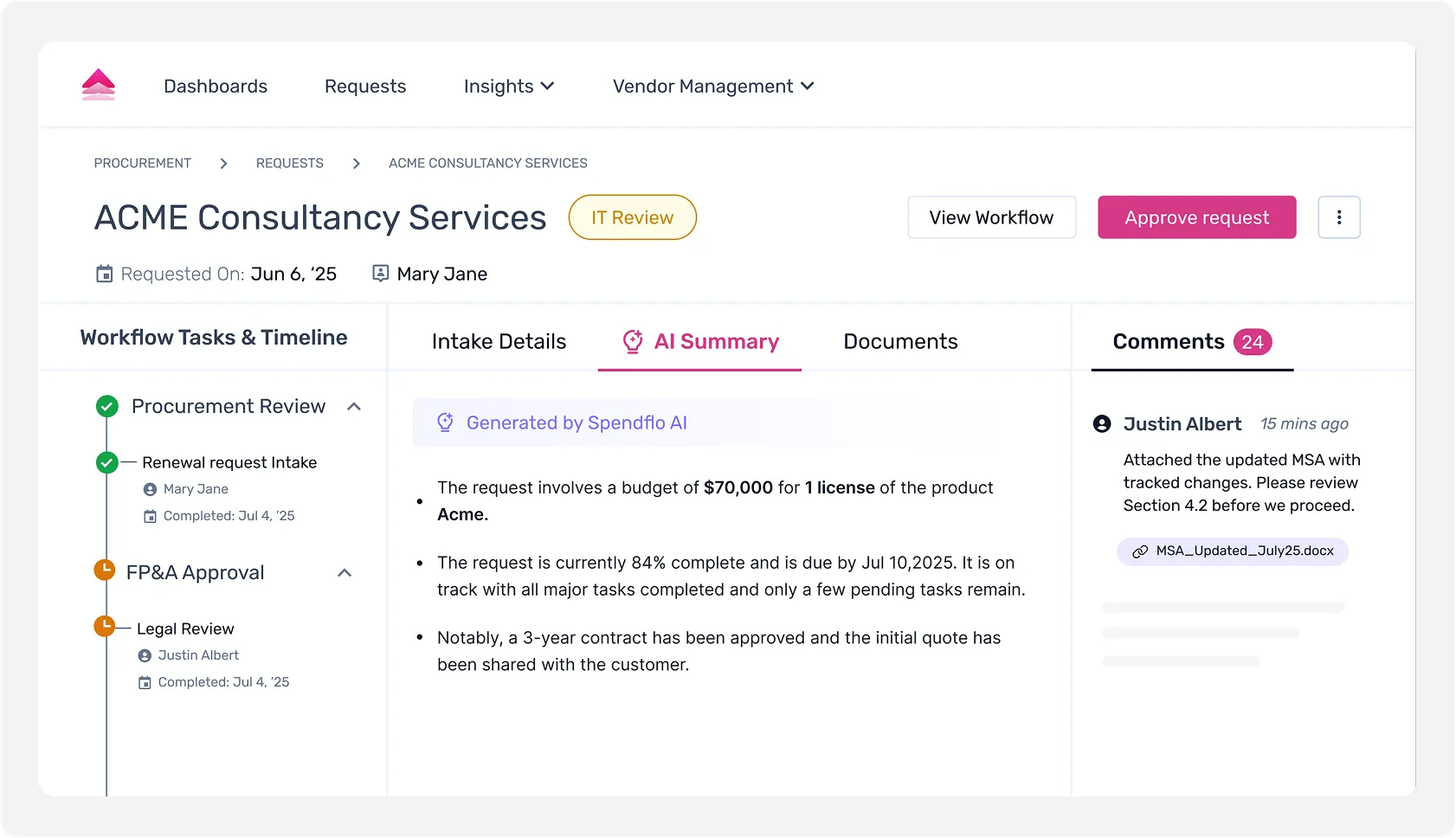 “Spendflo AI triages intake and guides them through the right workflows. Centralize contracts, approvals, vendor data, and docs in one place. AI tracks usage, sentiment, and timelines automatically.”