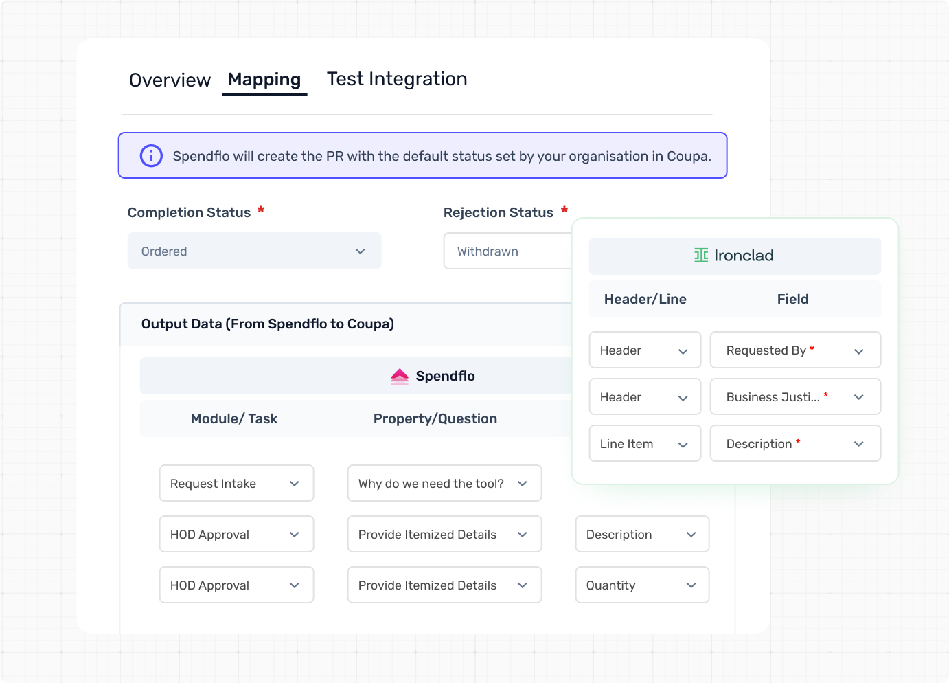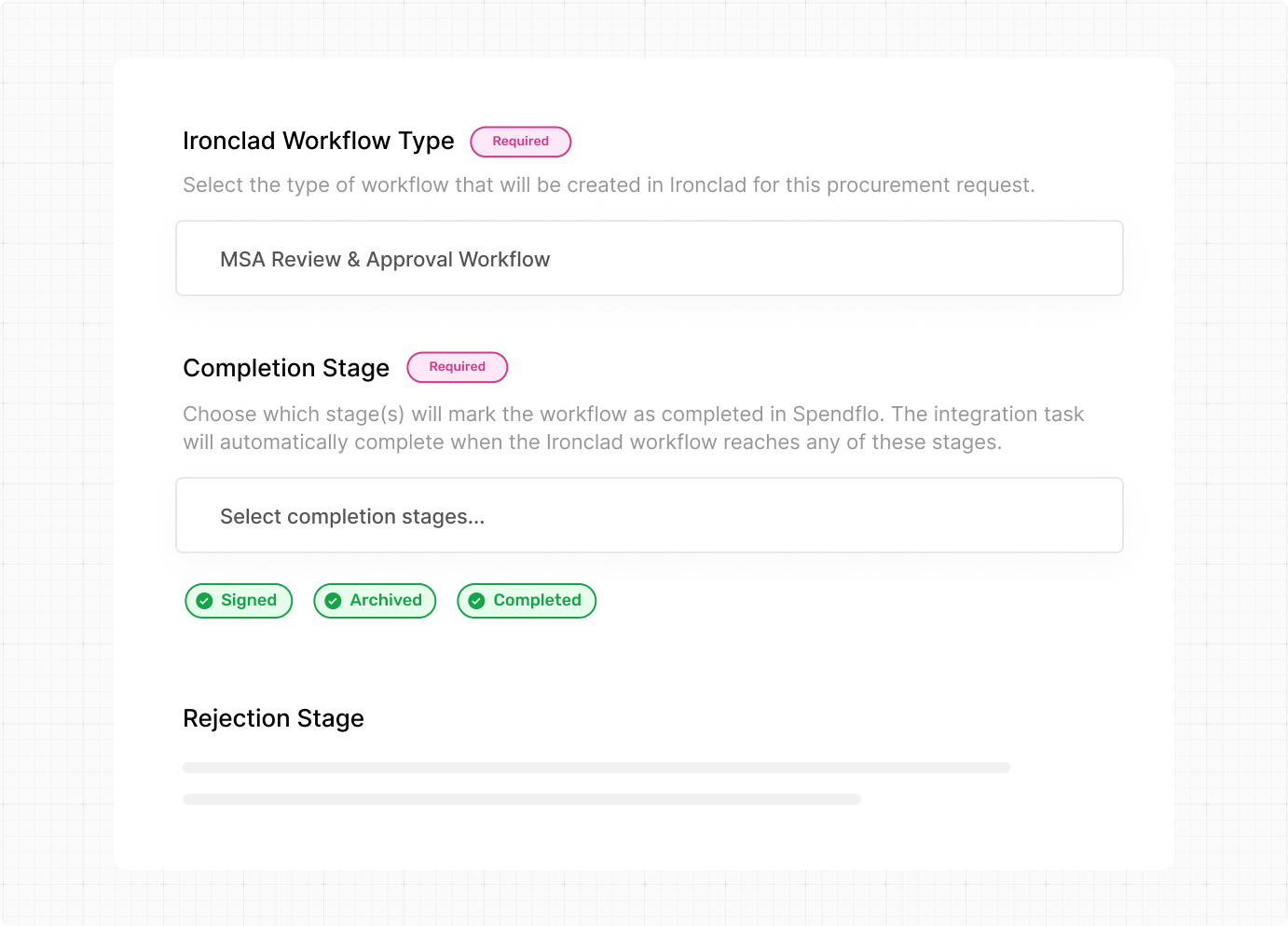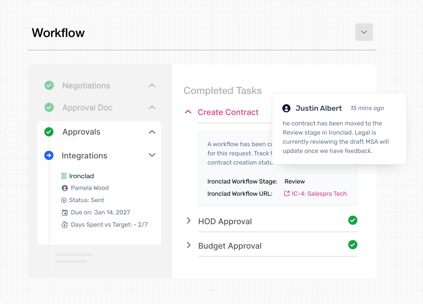 Launch an Ironclad workflow from every approved Spendflo intake with vendor data, approvals, and documents pre-filled, eliminating manual handoffs and delays between procurement and legal.