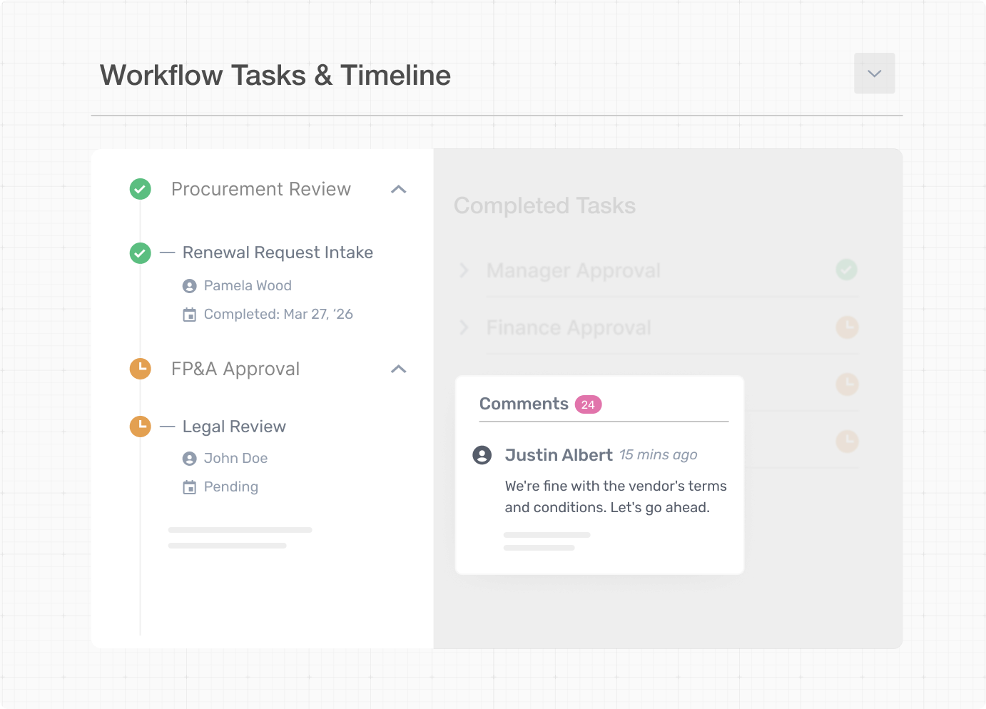 Track status, view pending approvals, and understand next actions in a single, transparent view. Stakeholders no longer need follow-up messages or side-channel updates.